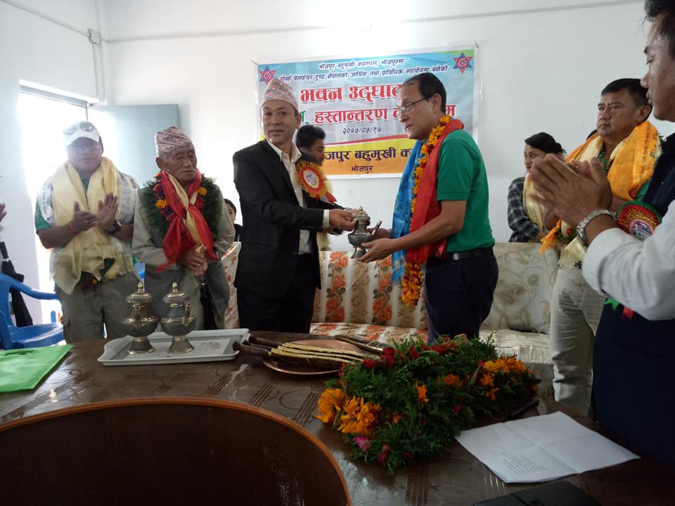 भोजपुर वहुमुखी क्याम्पसको दुई तले आठकोठे भवन ५ महिना मै निर्माण सम्पन्न भएको छ । करिब २ करोडको लागतमा वनेको उक्त भवन एक कार्यक्रमका विच आइतवार क्याम्पस प्रशासनलाई हस्तान्तर गरिएको छ ।भवन गोर्खा वेलफर ट्रस्ट नेपालको आर्थिक र प्राविधिक सहयोगमा बनेको हो । २०७४ साल कात्र्तिक २० गतेबाट शुरु भएको भवन निर्माणको काम ४ चैत्रमासकिएको थियो । गोर्खा वेलफेर ट्रष्टले पहिलो पटक क्याम्पसको भवन बनाइ दिएको हो । यस अघि विद्यालयहरुको मात्र भवन बनाउदै आएकोमा पहिलो पटक क्याम्पसको भवन निर्माण गरिएको गोर्खा वेलफेयर ट्रष्टका डेपुटि फिल्ड डाइरेक्टर मेजर हेमचन्द्र राईल वताए । भवन निर्माणमा एक करोड ९२ लाख ३७ हजार १६३ रुपैया खर्च भएको ट्रस्टले जनाएको छ ।भोजपुर क्याम्पसले १० प्रतिशत वापतको १७ लाख रुपैया जम्मा गरेको थियो । गोर्खा वेलफेयर ट्रष्टले नया भवन निर्माण गरि दिएसंगै क्याम्पसको पठन पाठनमा सहजता भएको क्याम्पस प्रमुख डाक्टर रोहितकुमार श्रेष्ठले वताए । साथै तिव्र गतिमा निर्माण सम्पन्न गरि वुझाएकोमा ट्रष्टलाई क्याम्पस प्रशासनको तर्फबाट धन्यवाद समेत दिए ।