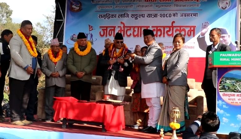 भोजपुर, २८ मंसिर । भोजपुरको पौवादुङमा गाउँपालिकाले पूर्व प्रधानमन्त्री केपी शर्मा ओलीलाई स्वागत तथा गाउँपालिका समस्याको विषयमा सर्वपक्ष माग पत्र हस्तान्तरण गरेको छ । झुलाघाट–चिवाभञ्ज्याङ समृद्धिका लागि सङ्कल्प यात्रा–२०८० को क्रममा पौवादुङमा आइपुगेका आलीलाई गाउँपालिकाले भब्य स्वागत गरेको हो । गाउँपालिकाको तर्फबाट तिवारीभञ्याङ अधेँरीघाट सडक र अधेँरीघाटमा पक्की पुल निर्माणको लागि माग पत्र हस्तान्तरण गरिएको गाउँपालिकाका प्रमुख प्रशासकीय अधिकृत नविन भट्टराईले जानकारी दिए । पूर्व प्रधानमन्त्री ओलीलाई यो सडक विषयमा विस्तृत रुपमा जानकारी दिइएको उनको भनाइ छ ।