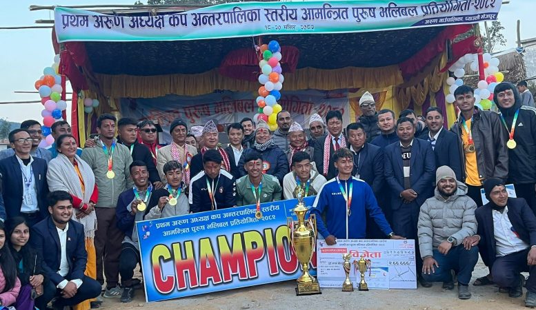 भोजपुर, २१ मङ्सिर । भोजपुरको अरुण गाउँपालिकाले आयोजना गरेको ‘प्रथम अरुण अध्यक्ष कप’ अन्तरपालिका स्तरीय आमन्त्रित पुरुष भलिबल प्रतियोगिताको उपाधि अरुण गाउँपालिकाले जितेको छ।
