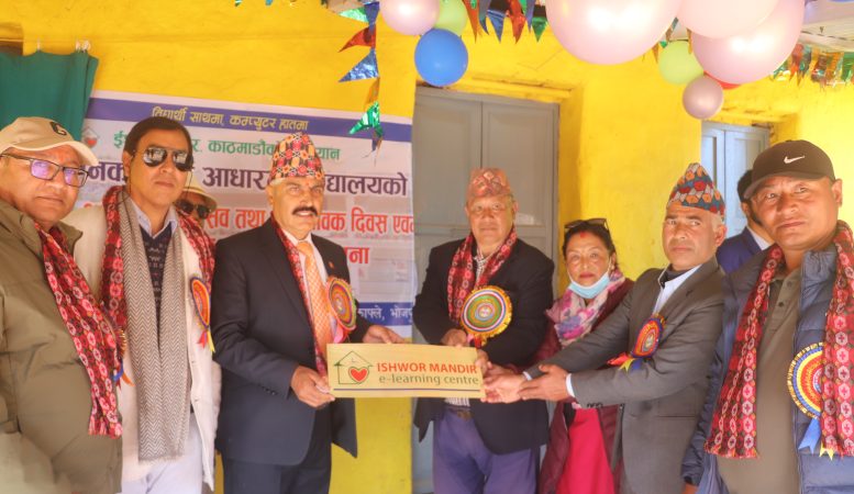 भोजपुर, २५ मङ्सिर । भोजपुर नगरपालिक –९ काफ्लेमा रहेको जनकल्याण आधारभूत विद्यालयमा ई–लर्निङ सेन्टर स्थापना गरिएको छ । विद्यार्थीहरुलाई समय सापक्ष प्रविधिमैत्री शिक्षणमा जोड दिन ई–लर्निङ सेन्टर स्थापना गरिएको हो । इश्वर मन्दिर काठमाण्डौँ अभियानले विद्यालयमा ई–लर्निङ सेन्टर स्थापना गरिदिएको हो । १० थान डेस्कटप कम्प्युटर, एक थान स्मार्ट टिभी वितरण गरेर यहाँ सेन्टर सञ्चालनमा ल्याएको इश्वर मन्दिर काठमाण्डौँका महासचिव संकेत कोइरालाले जानकारी दिनुभयो ।