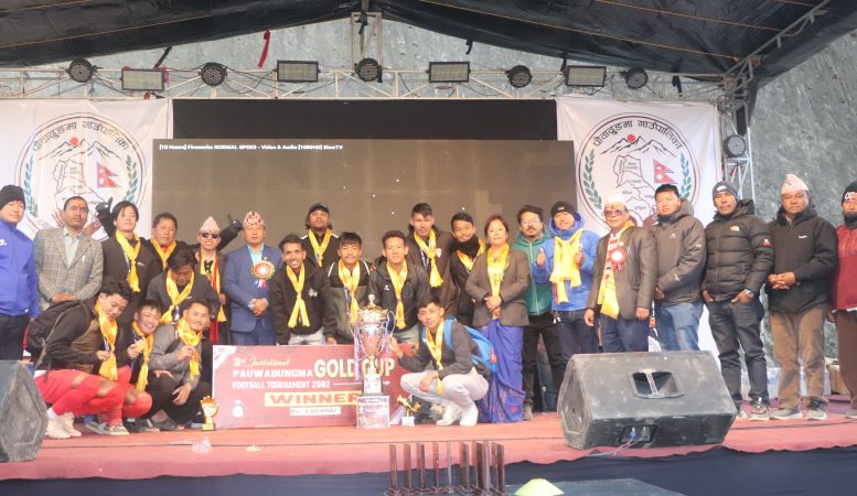 भोजपुर, २३ माघ । तेस्रो आमन्त्रित पौवादुङमा गोल्ड कप फुटबल प्रतियोगिताको उपाधि छथर गाउँपालिका, तेह्रथुमले जितेको छ । शुक्रबार सम्पन्न अन्तिम खेलमा अल स्टार फुटबल क्लब धरानलाई ४–२ गोलले पराजित गर्दै छथर गाउँपालिकाले उपाधि हात पारेको हो ।